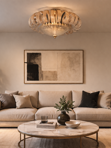 Each glass element is meticulously shaped to interact with light, transforming illumination into a soft, immersive glow. As light passes through the layered structure, it creates depth, reflections, and subtle highlights that enrich the spatial atmosphere. The result is not just brightness, but a carefully orchestrated ambiance.