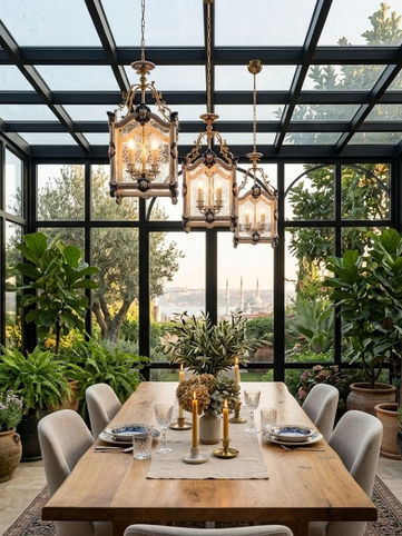Venier Lantern blends classical elegance with a bold decorative character. The handcrafted ceramic body, detailed with deep cobalt blue motifs, frames intricately etched glass panels that elevate the visual depth of light. Its warm illumination reveals subtle textures while the gold suspension structure adds a refined contrast. Designed to enrich entrances, dining areas and winter gardens, Venier creates a strong yet graceful lighting statement.