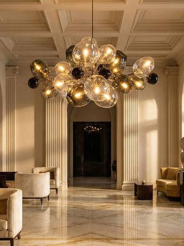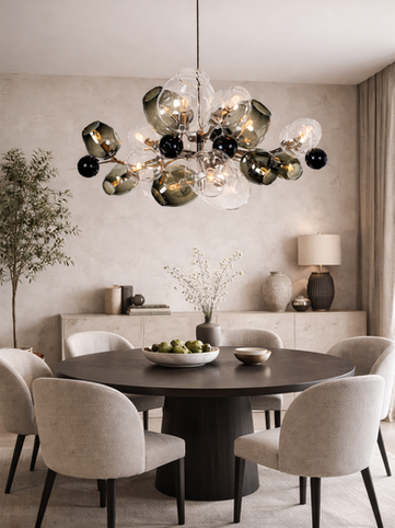Inspired by the organic movement of light in space, the Lind Large Chandelier is designed as a living composition rather than a static object. Each glass sphere is carefully positioned to create a sense of controlled randomness—where reflections overlap, depth is amplified, and light becomes layered. The interplay between transparency and reflection gives the piece a constantly evolving character throughout the day, shifting from a subtle daytime presence to a luminous focal point at night. Lind Large is not just a lighting fixture, but a spatial signature that defines the atmosphere it inhabits.