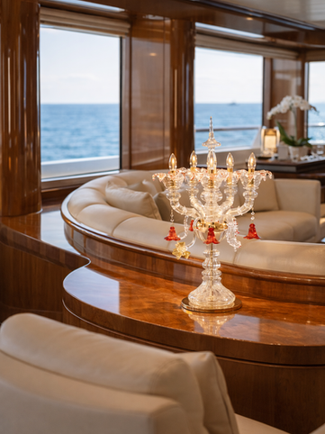 An expressive composition of transparency and color, this design reinterprets classical chandelier language through a lighter, more playful lens. The flowing glass arms create a sense of movement, while the delicate colored drops introduce contrast and character. When illuminated, it delivers a warm, sparkling ambiance that enhances the atmosphere with subtle brilliance.