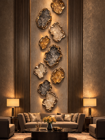Rather than functioning as a conventional wall light, DELTA behaves like an illuminated art object. The contrast between the molten-like metal contours and the crystalline glass surface creates depth, movement, and visual intrigue. When illuminated, the textured glass softly radiates light outward, producing a warm and sophisticated ambience.