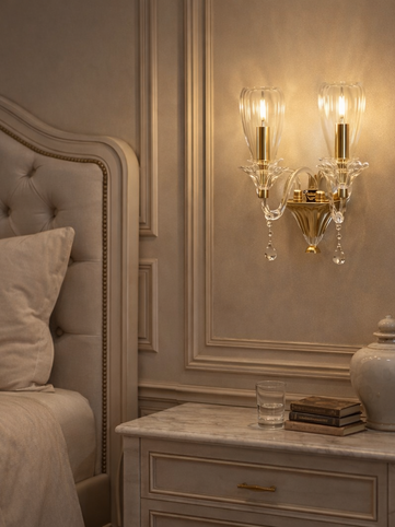The ELFO Wall Sconce transforms wall lighting into a decorative design element with its sculptural glass form and refined metal detailing. Ribbed glass shades diffuse light softly while the clear glass arms and crystal drop accents add a sense of elegance and movement. Balancing classic and contemporary aesthetics, it introduces a sophisticated lighting atmosphere and timeless character to interior spaces.