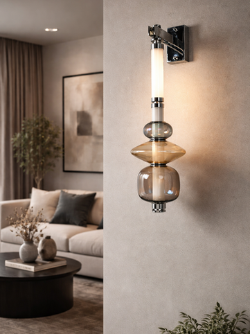 Complementing this linear form, the sculptural Murano-inspired glass elements introduce depth, color, and artistic expression. Each glass layer reflects light differently, producing subtle visual dynamics that elevate the overall ambiance.