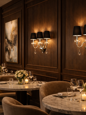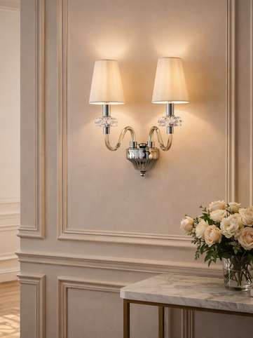 Soline wall sconce combines timeless elegance with refined craftsmanship. Featuring gracefully curved metal arms, crystal ring details and elegant fabric shades, it creates a warm and balanced ambient light. The sophisticated composition of metal, crystal and textile elements adds depth and character to the wall, making it an ideal lighting piece for luxury living rooms, refined dining areas and elegant hospitality interiors.
